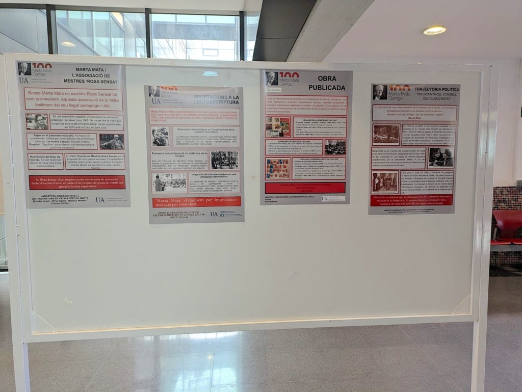 La Facultat d’Educació de la Universitat d’Alacant (UA) acull una exposició dedicada a la pedagoga Marta Mata i Garriga amb motiu del centenari del seu naixement. La mostra, elaborada per l’alumnat de segon del Grau d’Educació Infantil, com a part de les pràctiques de l’assignatura Habilitats comunicatives i lectoescriptura en Català (HACLECat), es pot visitar al hall del centre durant la Setmana Cultural i valora la trajectòria d’una de les figures més influents en la renovació pedagògica contemporània.