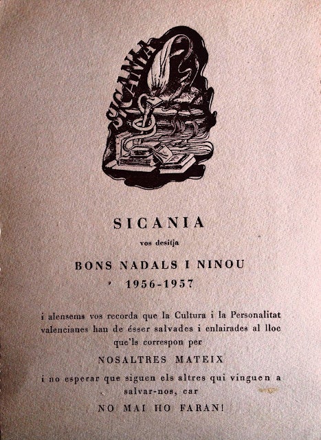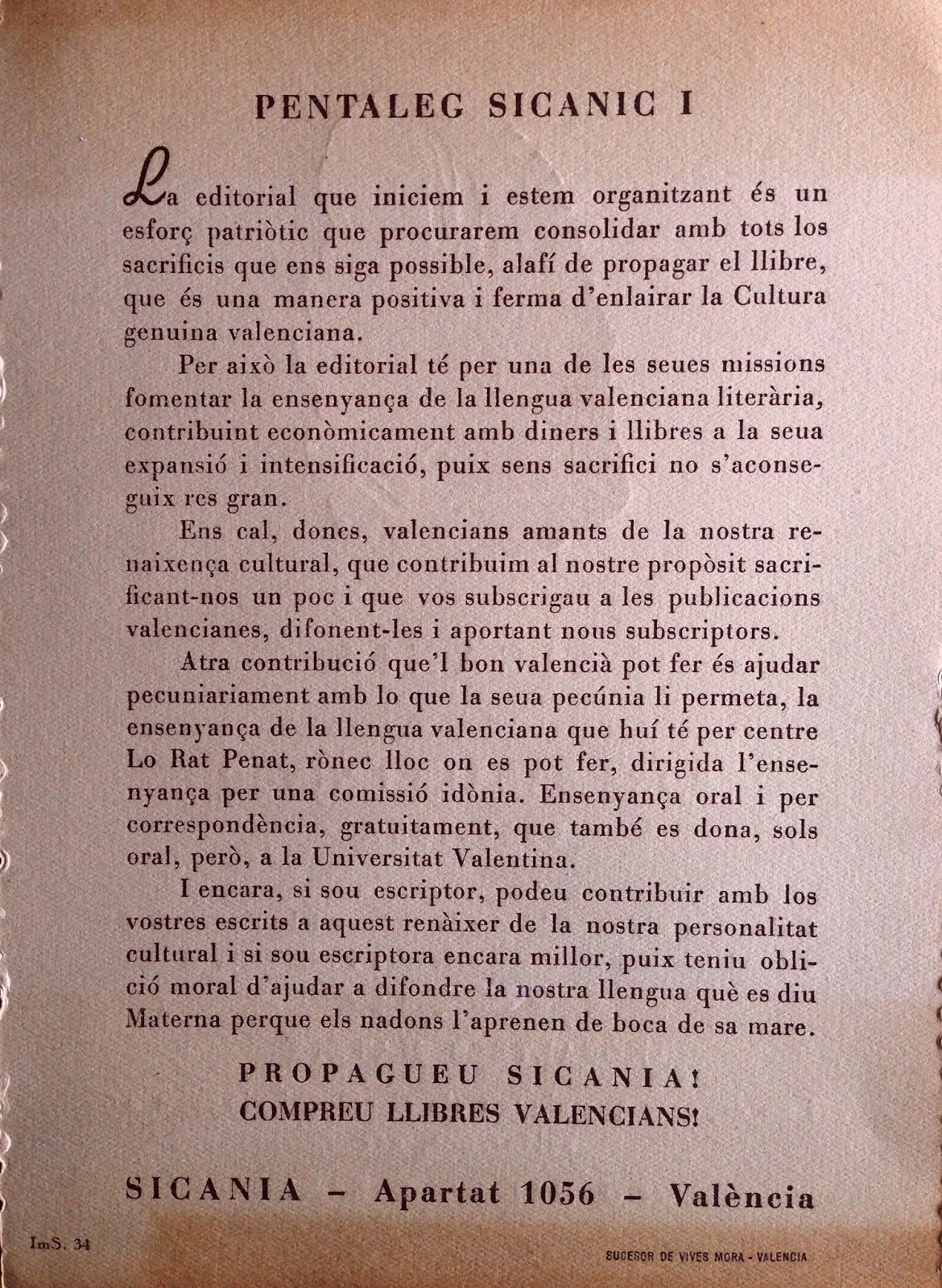La editorial que iniciem i estem organitzant és un esforç patriòtic que procurarem consolidar amb tots los sacrificis que ens siga possible, alafí de propagar el llibre, que és una manera positiva i ferma d’enlairar la Cultura genuïna valenciana.