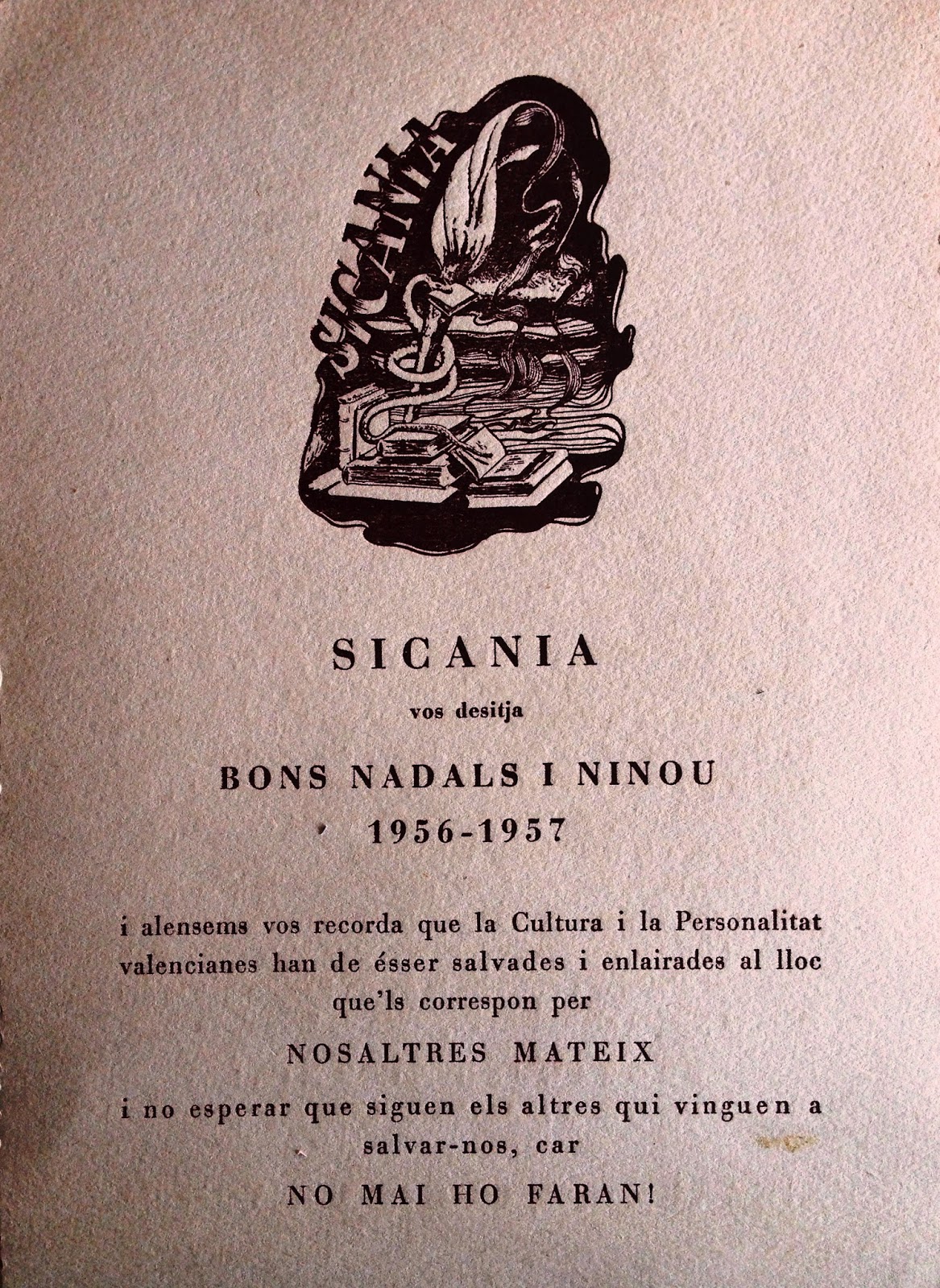En el revers de la felicitació Nicolau Primitiu Gómez va reproduir el Pentàleg Sicànic I, una sèrie de reflexions articulades en uns textos breus, de cinc punts escassos, però molt directes i clarificadors, destinats a despertar la consciència com a poble dels seus lectors, i que a la vegada li serviran per articular el seu pensament i els seus ideals valencianistes.