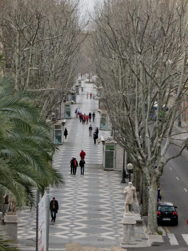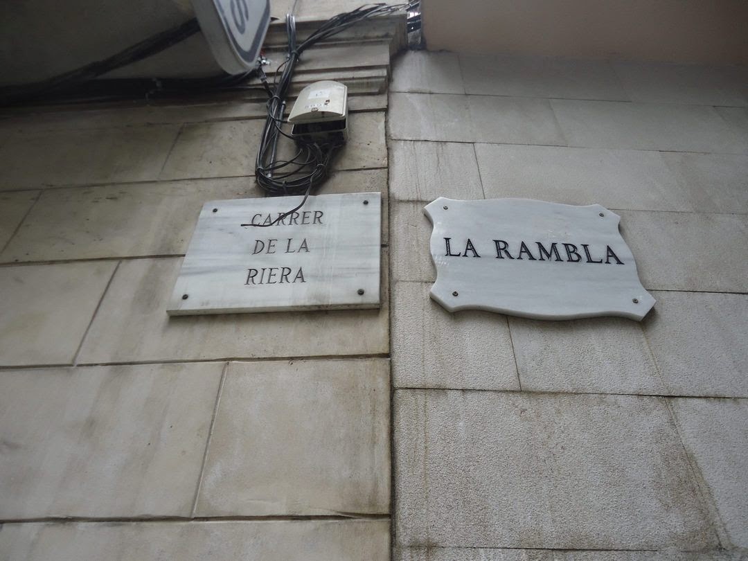 Rambla. Passeig d’una població. Passeig fet al llit d’una antiga rambla o riera. la Rambla, a Ciutat de Mallorca, com veiem en el següent cartell és coincident amb la segona accepció.