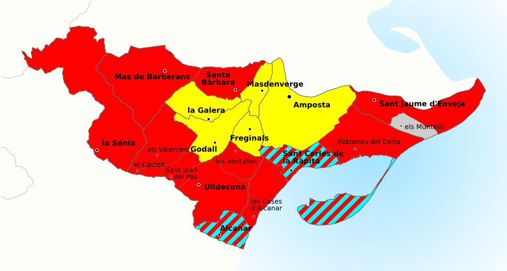 A propòsit de la dissimilació que observem en birla > mirla, hi ha el mateix fenomen en menar > benar, en l’accepció de dirigir, conduir algun objecte giratori. En el treball de camp de la nostra tesi sobre els parlars del Montsià, hem observat com la ‘desorientació’ del verb original menar (de color roig en el mapa adjunt), el qual ha perdut el seu ús originari, ha donat altres interpretacions per part dels parlants. Aquest és el cas, p. ex., d’Alcanar o la Ràpita (en blau al mapa adjunt) en què l’acció per a fer girar la corda per dos extrems i que algú salte s’anomena també benar. Joc de bilabials equivalent a l’observat en la birla > mirla santmatevana. En aquest cas la dissimilació s’origina des de la bilabial oclusiva sonora a la bilabial nasal, en el cas canareu el fenomen és invers, de la nasal a l’oclusiva. Aquesta ‘desorientació’ o pèrdua de sentit del significat -recordem que el ‘sentit’ etimològic ens emparenta amb el sema del significant- ha donat també altres versions en què el parlant interpreta un verb més proper com remar, a Amposta, Freginals, la Galera, Godall o Masdenverge (color groc del mapa adjunt), encara que l’acció, evident, no tinga res a veure amb el moviment de braços que cal fer per a fer avançar una nau de rems i el moviment de fer girar la corda i saltar.