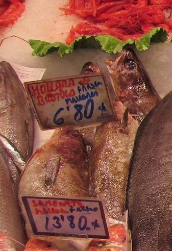 Veiem com hi ha una certa confusió, pel semblant, entre la mòllera i la bròtola; de fet, la bròtola rep també el nom de mòllera de fang. Fixem-nos primer en el cartell de la dreta, mallorquí (del mercat de l’Olivar, a Ciutat) que mostra els dos noms MOLLARA (amb neutralització de la vocal posttònica) o BRÒTOLA. Al mercat del Ninot de Barcelona, a on corresponen les altres dues fotografies, separaven mòlleres de les bròtoles i ens feien adonar-nos que la bròtola (dalt) disposa d’uns filaments que no té la mòllera.