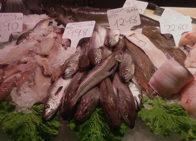 Des de fa uns anys ens arriba el peix del Cantàbric, si no fresc, refrigerat, i la retolació transforma el lluç, també fresc, en ‘merluza’… i la gent en diu ‘merlussa’. Com que a la Mediterrània sol ser més menut rep el diminutiu de llucet, com ens diu el rètol de la fotografia de més amunt (mercat del Ninot, a Barcelona). Sortosament, al mercat de Vinaròs apareix ben retolat.