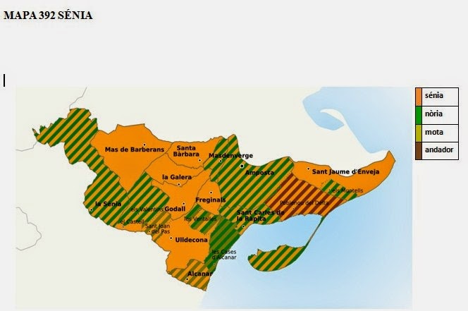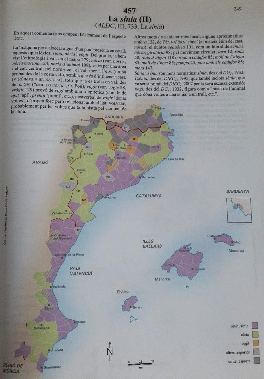 Una informació centrada a la zona del Montsià, precisa i preciosa, ens l’ofereix la dialectòloga Àngela Buj. Hi podem veure la varietat lèxica i els doblets al voltant de la sénia-nòria on s’afegeix ‘mota’, túmul on situem l’enginy, i ‘andador’ recollit al Poblenou del Delta.