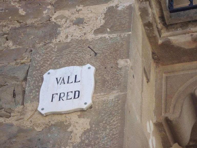 VALL FRED, on també es veuen trossos de muralla que s’han conservat, i aquí si que es veu el nom autèntic en una placa posada en una paret. Ja es veu que al matí queda més a l’ombra del sol, i d’aquí el nom de fred.