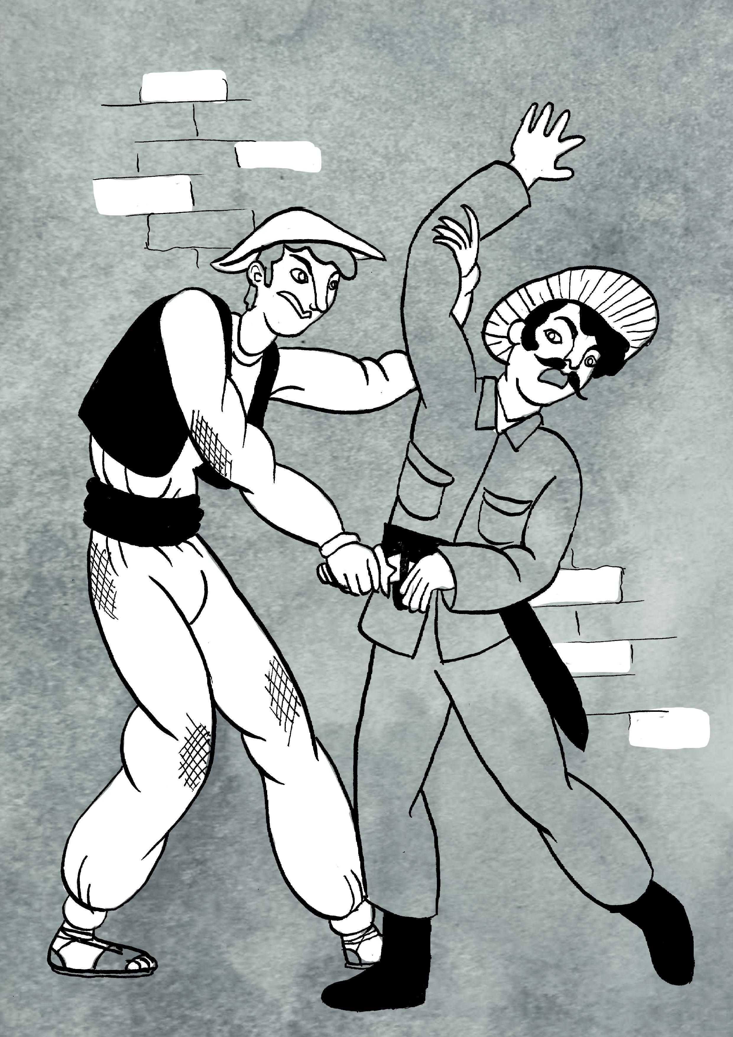 En quasi totes les portes sonava l’acordió amb una melancolia cridanera, la guitarra amb rascades somiadores i el cant desentonat i estrident a l’uníson. Alguna vegada, pels cantons, esclatava una tempesta d’udols: l’estrèpit de la lluita cos a cos. Els antipàtics gossos xatos xocaven els amenaçadors caps de foca fins que un colp de cadira d’algun veí de bona voluntat els aüixava.