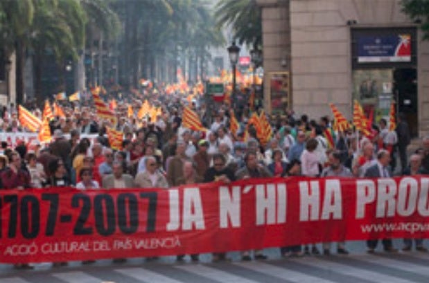 2007.- Manifestació multitudinària de més de 70.000 persones, segons l’organització, per a commemorar els 300 anys de la desfeta d’Almansa i en defensa del País Valencià.