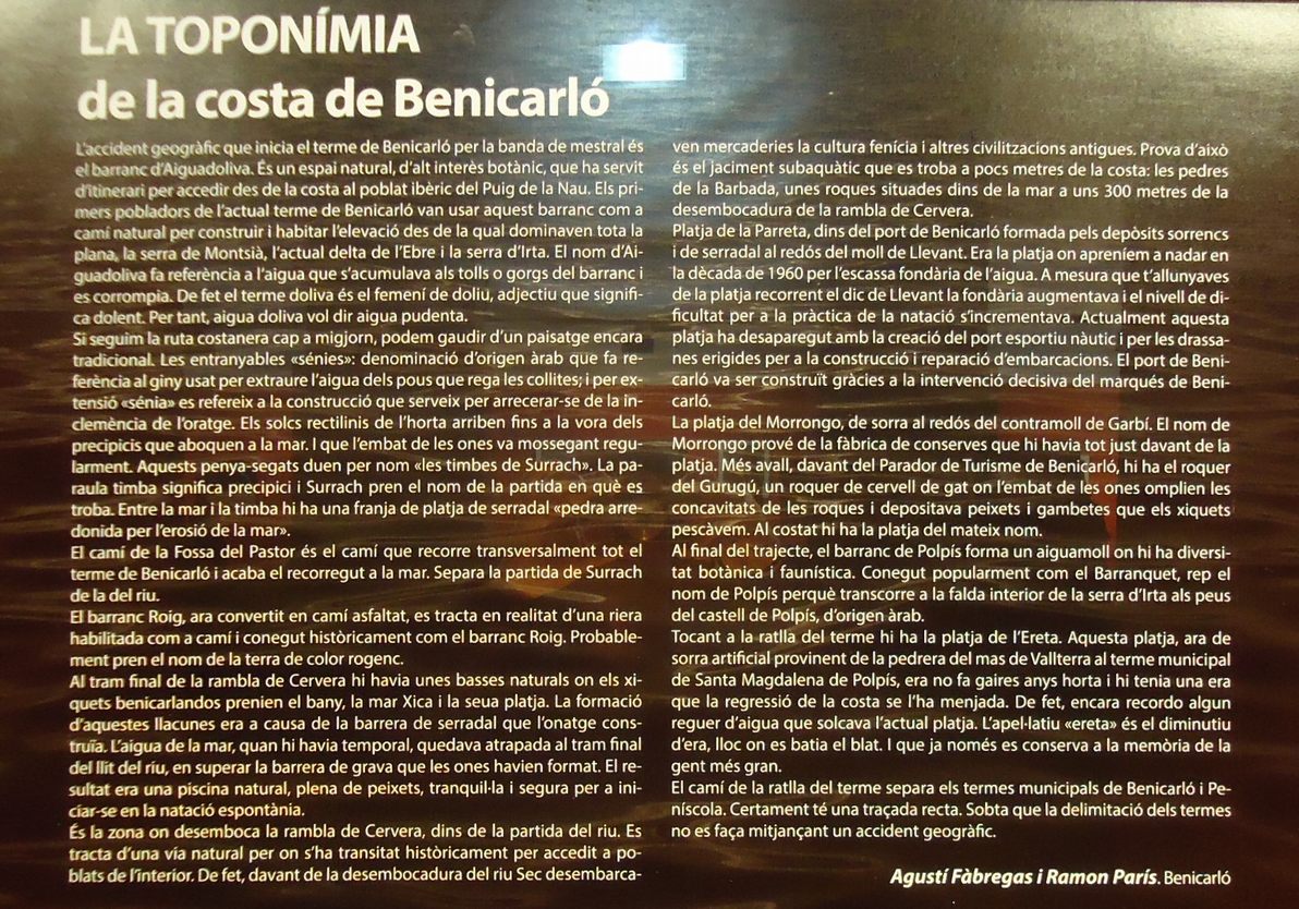 Peníscola: el Bufador, roca dels Artillers, la Porteta, ullal de l’Estany, Llandells, platja Nord o de Llevant, les Argires, camí Nou, carretera a Benicarló, séquia del Rei, séquia Templera, séquia Sangonera, les Villes, lo Prat, assagador de la Creu, lo Trencat.