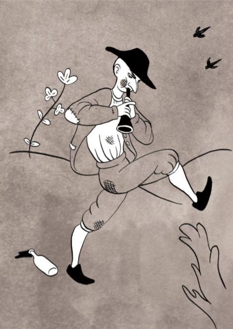 Tal vegada, en els somnis de borratxo melancòlic, havia pensat, mirant el ventre unflat de la Borratxa, en la possibilitat que, amb el temps, un xic panxut, amb cara de pillastre, un Dimoniet, acompanyara, pegant-li al tabalet, les escales vibrants de la dolçaina. Ara sí que estava a soles. Havia conegut la fortuna per a després tindre una situació més trista. Havia sabut què era l’amor, per a conéixer el desconsol: dos coses que ignorava abans d’entropessar amb la Borratxa.