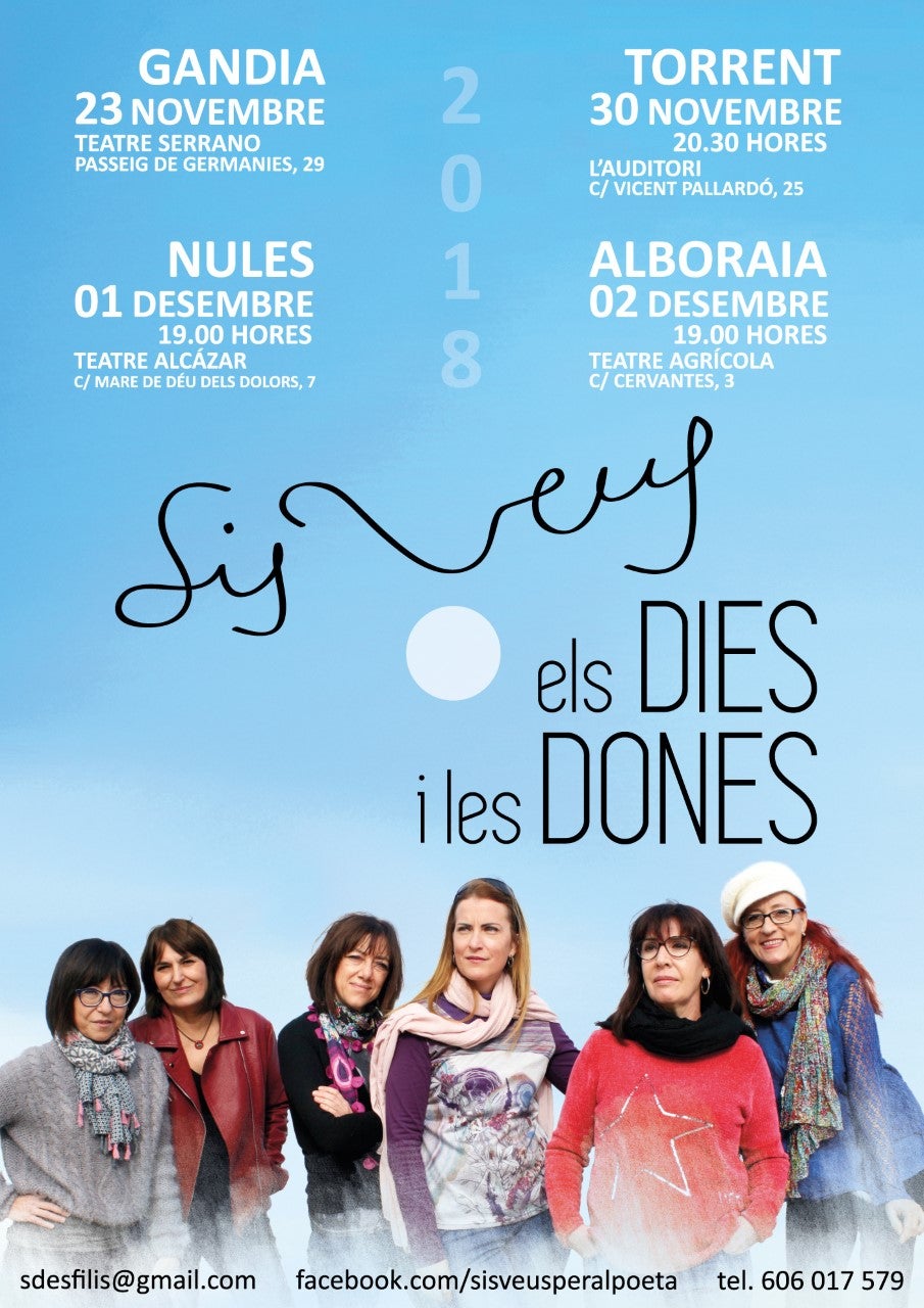 Eva Dénia. Després de cinc anys rodant l’Homenatge a Vicent Andrés Estellés, decidim que és hora d’iniciar un nou projecte. Sis veus per al Poeta es transforma en Sis Veus i el nou espectacle, Els dies i les dones, comença a prendre forma. Una selecció de peces tradicionals a les quals he posat lletra seguint un fil conductor: la dona en els diferents moments del cicle vital. La terra com a origen de tot, les llavors que se sembren i donen fruits. El naixement, la infància, l’adolescència, la joventut, la maduresa, la vellesa i la mort. I, de nou, el cicle que comença. I sempre l’esperança en un món millor. Peces tradicionals amb lletres i arranjaments nous però també composicions pròpies. Concretament, un tema de Maribel Crespo, un meu, un de Vicent Torrent i un de Carles Dénia. I entre cançó i cançó, la poesia de Lola Andrés –una de les veus més originals de la lírica valenciana actual– escrita expressament per a aquest projecte i recitada alternativament per les sis arrodonint la història que volem contar.