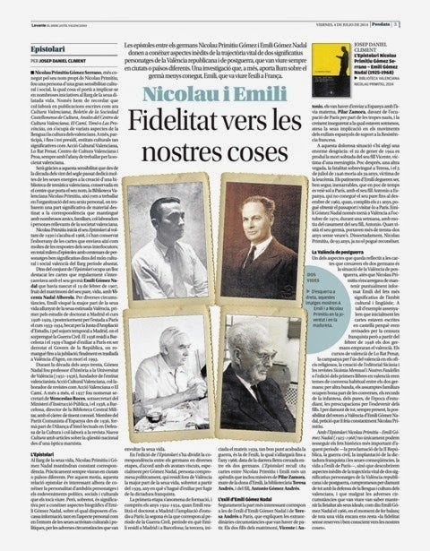 Les epístoles entre els germans Nicolau Primitiu Gómez i Emili Gómez Nadal donen a conéixer aspectes inèdits de la trajectòria vital de dos significatius personatges de la València republicana i de postguerra, que van viure sempre en ciutats o països diferents. Una investigació que, a més, aporta llum sobre el germà menys conegut, Emili, que va viure l’exili a França.