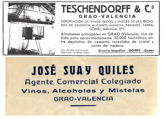 L’altre producte estrella de l’exportació valenciana va ser el vi, la mistela i l’aiguardent. De fet, aquests havien estat la principal font de divises fins a la dècada de 1920, quan van ser superats per la taronja. Els exportadors del segle XIX i XX es dedicaren fonamentalment a l’exportació de vi a granel. El seu domini del mercat i el control dels preus deixava poc de marge per a la millora dels mètodes d’elaboració per part dels agricultors o cellerers, que en el cas dels vins exportats per València procedien fonamentalment de Godelleta, Utiel, Requena i de les àrees limítrofs de la Manxa. En la dècada de 1970 es produeix un canvi de tendència en alguns exportadors i productors valencians, que començaren a produir vins elaborats de major qualitat, amb presentacions cuidades i tenint en compte una política de marques. El comerç del vi agrupava una complexa xarxa d’agents públics i privats que circulaven entre diferents espais, com oficines comercials, laboratoris, cellers, patis per a assolellar i filtrar els vins, magatzems de pipes, tallers de reparació d’envasos i tonells i institucions oficials que hi havia tant dins com fora del port. En relació amb els actors privats, n’hi havia agents de duanes (encarregats de preparar el documents de deute, lliurament o reexpedició de les mercaderies) i consignataris de vaixells (que representaven els armadors dels vaixells). Altres estaven relacionats més específicament amb el comerç del vi, com per exemple els intermediaris i els agents comercials (com Martínez Bermell, Algarra o Suay), exportadors locals (per exemple Gandia Pla, Mompó o Garrigós) i d’origen estranger (com Schenk, Steiner, Egli, Teschendorff o Valsiangiacomo) (figura 2). Els noms de molts d’ells es troben en els voluminosos llibres de registres que hi ha al laboratori duaner de València.