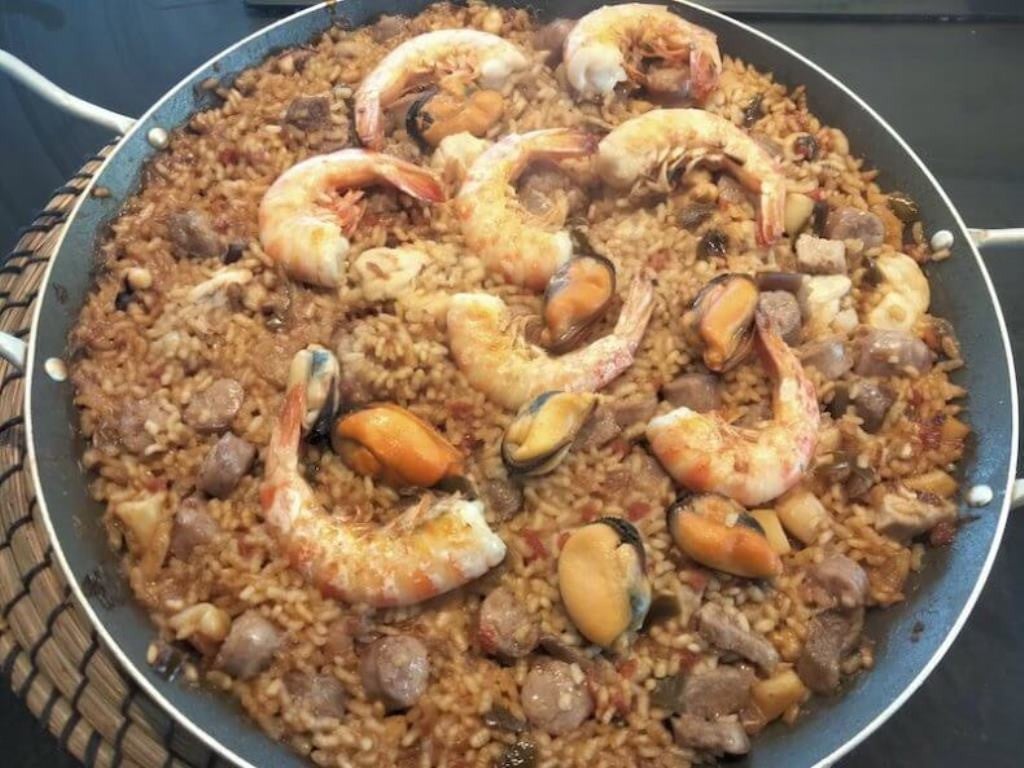 Ingredients: 400 g d’arròs, 250 g de pollastre, 200 g de llom de porc (en 4 tallades fines), 2 botifarres crues (la llonganissa del català occidental), 150 g de rap, 4 calamarsons, 4 llagostins, 250 g de clòtxines, 1 ceba, 4 carxofes, 1 pimentó vermell, 100 g de pésols, 2 tomaques madures, alls, pebre roig, safrà, oli i sal.