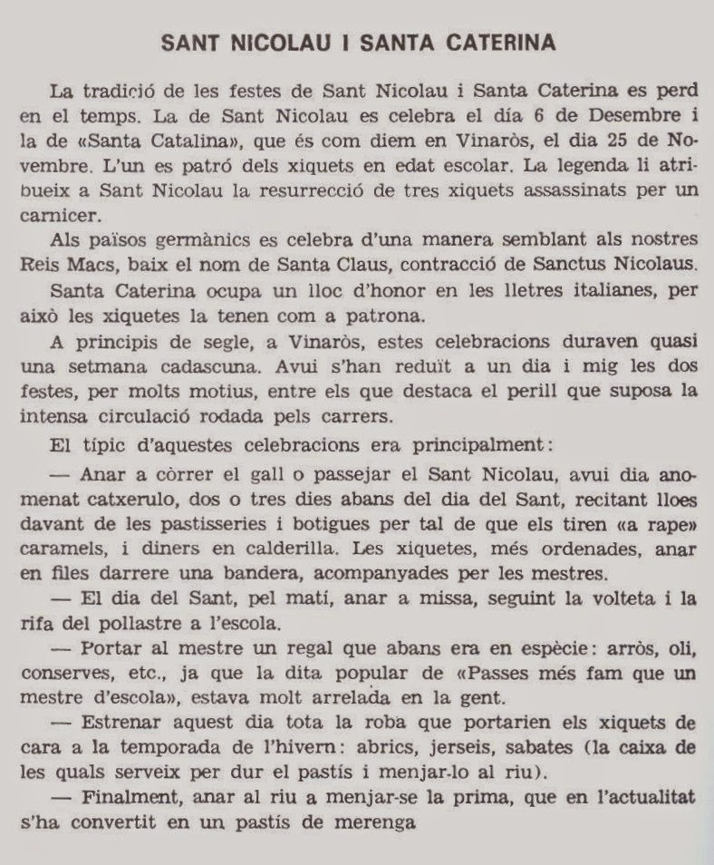 Santa Catalina era la patrona de totes les costures de xiques, de les més grans, de les mitjanes i de les menudes, que eren les que anàven amb Donya “Carmen” i dels xiquets que també anàvem amb ella. Dels xics mitjans i grans, no ho era. Era Sant Nicolau.