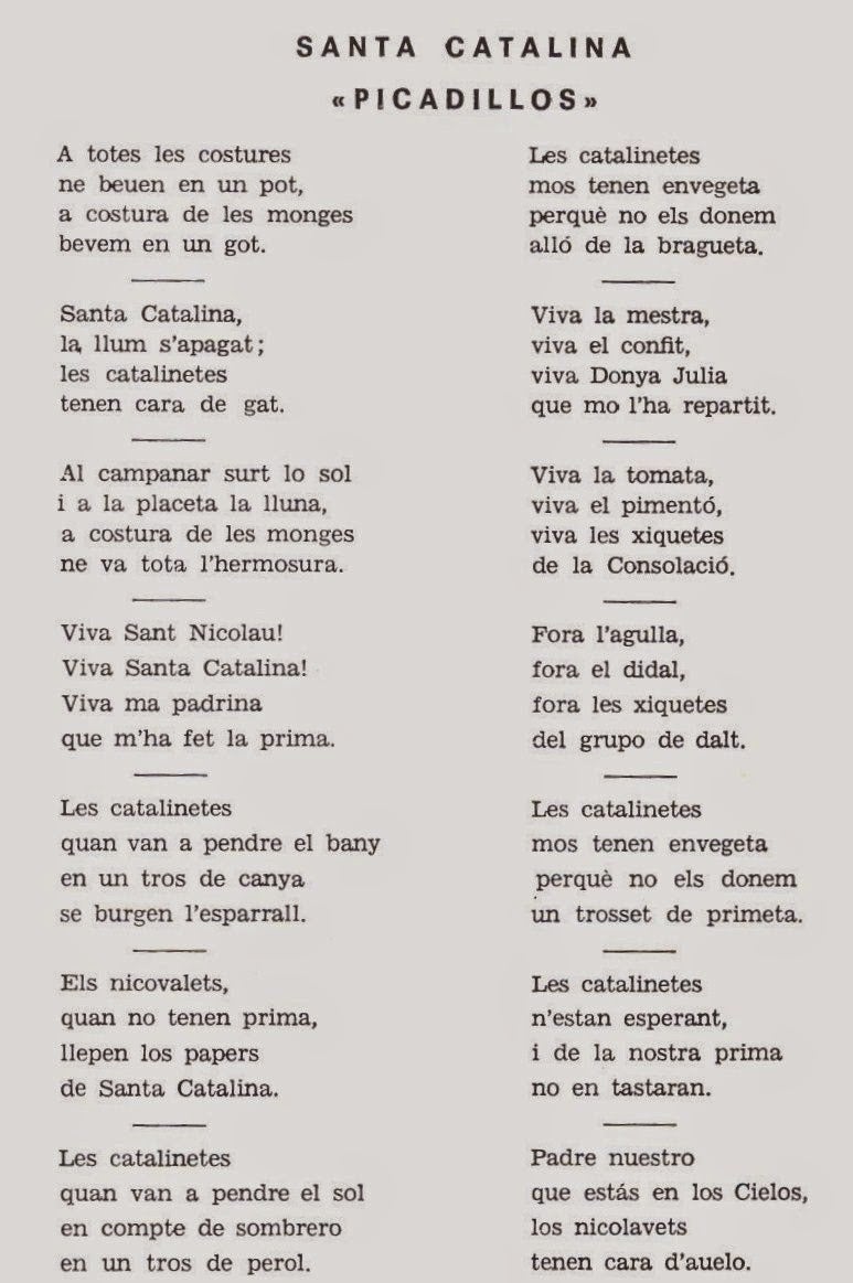 “Les CATALINETES/roden pel molí,/ una coca bamba/ i un trago de ví”, o la variant,