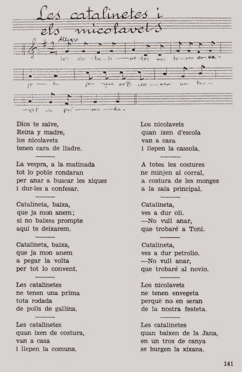 “Tú, Catalineta,/ tú, que vas i vens/, dis-li a ta mare,/ que vinga correguents”.