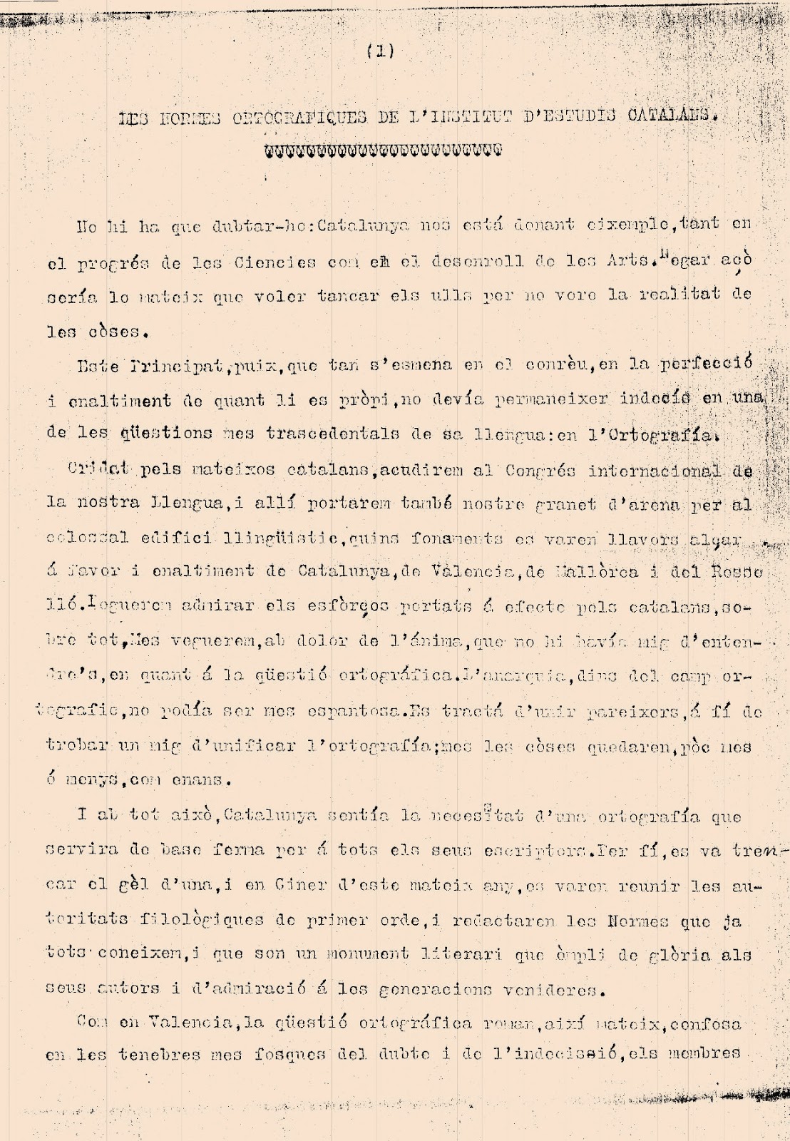 La primera Norma ortogràfica proposada pèls membres de l’Institut d’Estudis Catalans […] consistix en substituir per la nostra e, la a postònica que ells usaven tant en els noms com en els verbs. Escrivien la majoria dels catalans: Tu amas las bellas rosas. I els valencians, ab molts catalans: Tu ames les belles roses. És puix esta norma molt nostra i per ells devem estar molt agraïts als catalans, puix que deixant la seua grafia han adoptat la nostra, en gràcia de la uniformitat entre’lls i nosatres.