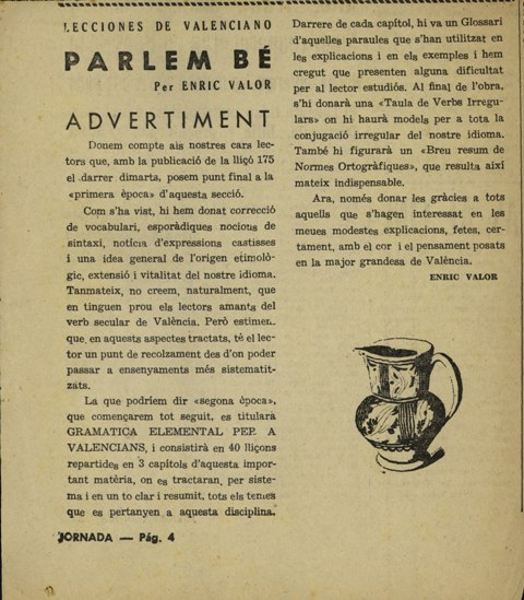 Jornada aspira a contribuir, en la medida de sus posibilidades, tanto a la divulgación como a la depuración de nuestra lengua vernacula. Los valencianos debemos hablar mas en nuestra lengua. Y debemos asimismo aplicarnos en hablar mejor, con un mayor rigor filológico, pues de lo contrario el idioma del país valenciano corre el peligro de perder su prestancia y su propia personalidad. Jornada aporta a esta empresa una serie de lecciones —hoy publicamos la primera— que explica con amenidad y sencillez el ilustre gramàtico Enric Valor, bajo el título de «Parlem bé». Enriquecer nuestra lengua vernàcula y divulgar su conocimiento es tanto como cuidar uno de los mas bellos filones del acervo cultural de España. Esta idea es la que ha venido a inspirarnos la publicación de estas lecciones.