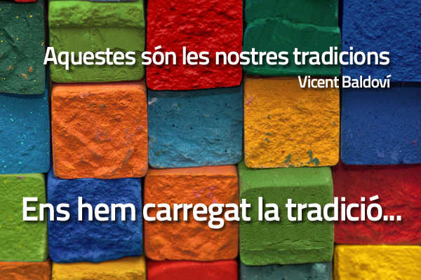 Ens acusen de voler carregar-nos les seues tradicions. No reconèixer-ho seria un error i és veritat que estem canviant la forma de fer política i sobretot la forma de treballar. Tradicions que gens tenen a veure amb allò que perdura pels anys i que la història ni nosaltres podem canviar. Simplement són gestos que determinen el tarannà dels nous governants. Que milloren la vida de les persones. Que demostren que una altra manera de fer política és possible. Ens hem carregat la tradició de només escoltar parlar el castellà. Per fi es parla en la llengua dels valencians. Tant el President de la Generalitat com l’alcalde de València saben parlar la nostra llengua. És un goig escoltar-los. Ens hem carregat la tradició i hem començat a posar l’educació a l’abast de tots. Hem innovat amb la gratuïtat dels llibres de text.