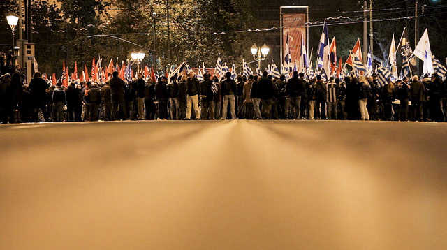 AC.- Walter Benjamin deia que el feixisme és el resultat d’una revolució perduda. I a Grècia l’esquerra ha perdut moltes revolucions: s’ha quedat en confortables despatxos o sales d’estar enlloc de sortir al carrer. I jo m’incloc en l’autocrítica. Quan en un barri tenen problemes seriosos i diuen que ja no poden tenir més immigrants… no podem respondre que està ple de feixistes. El que fa Alba Daurada és un circ, un teatre, però l’aparença és que intenten donar solucions als problemes que pateix la gent… mentre que l’esquerra únicament es dedica a negar-los. No s’ha d’oblidar que l’EAM (Front d’Alliberament Nacional) i ELAS (Exèrcit Popular d’Alliberament Nacional), els grups que van combatre a la guerra civil, es van fer un nom repartint aliments sota l’ocupació nazi. Som massa elitistes per baixar a terra i ajudar la gent: tenim grans anàlisis però no donem respostes allà on ens les demanen. I no sabem oferir alternatives concretes. Si l’esquerra hagués estat al carrer, ara seria al govern.