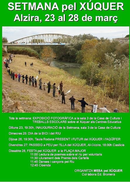 En la darrera assemblea oberta de la Mesa pel Xúquer, que es va fer per desembre ací a Alzira, es va aprovar organitzar una setmana d’activitats pel Xúquer en Alzira a fi d’anar canviant aquesta tendència: