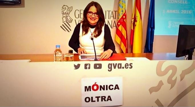 Deixada de banda la samarreta combativa, renunciada en el fragor de la victòria electoral, la vicepresidenta –i consellera d’Igualtat– a què ens referim, ha trobat en la paraeta combativa una nova, i sorprenent, estratègia de comunicació. La foto s’ha fet popular: davant la paraeta exhibia ella un cartell amb la llegenda “mÓnica” i declarava: “Sóc Mónica Oltra, amb ‘o’ tancada, i agrairia que es posara el meu nom correctament. Em diuen Mónica Oltra, ací i en la Xina Popular. M’agrada així.”