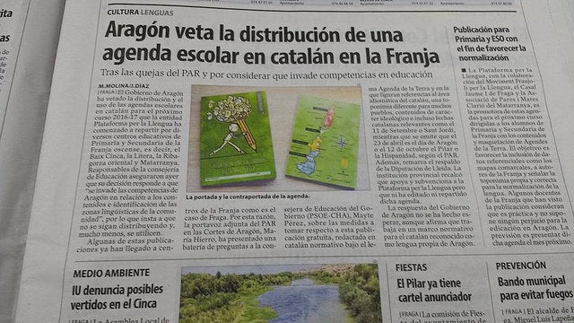 I vet aquí que les agendes (ja reservades a centres de totes les comarques catalanoparlants d’Aragó) van topar amb la política d’interessos de partit i les queixes pel fet que els xiquets i xiquetes de la Franja tingueren agendes en la seva llengua i amb informació d’arreu de les terres catalanòfones (dates assenyalades, diades, mapes lingüístics i comarcals, etc.) van transcendir a les Corts aragoneses de la mà del PAR, per la qual cosa el Govern aragonès va ordenar, llavors, que es retiressin les agendes i no les fessin servir als centres educatius el curs vinent per “envair competències d’Aragó en relació als continguts i identificació de les zones lingüístiques de la comunitat”.