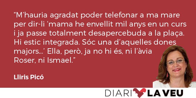 Abraçada al meu sarnatxo ple amb la fruita per als meus fills vaig tornar a casa que no veia el carrer. M’hauria agradat poder telefonar a ma mare per dir-li “mama he envellit mil anys en un curs, i ja passe totalment desapercebuda a la plaça. Hi estic integrada. Sóc una d’aquelles dones majors…” Ella, però, ja no hi és, ni l’àvia Roser, ni Ismael. Se m’ompli de morts el cabàs de fer la plaça i veig que en el toll de l’enyor no faig peu.