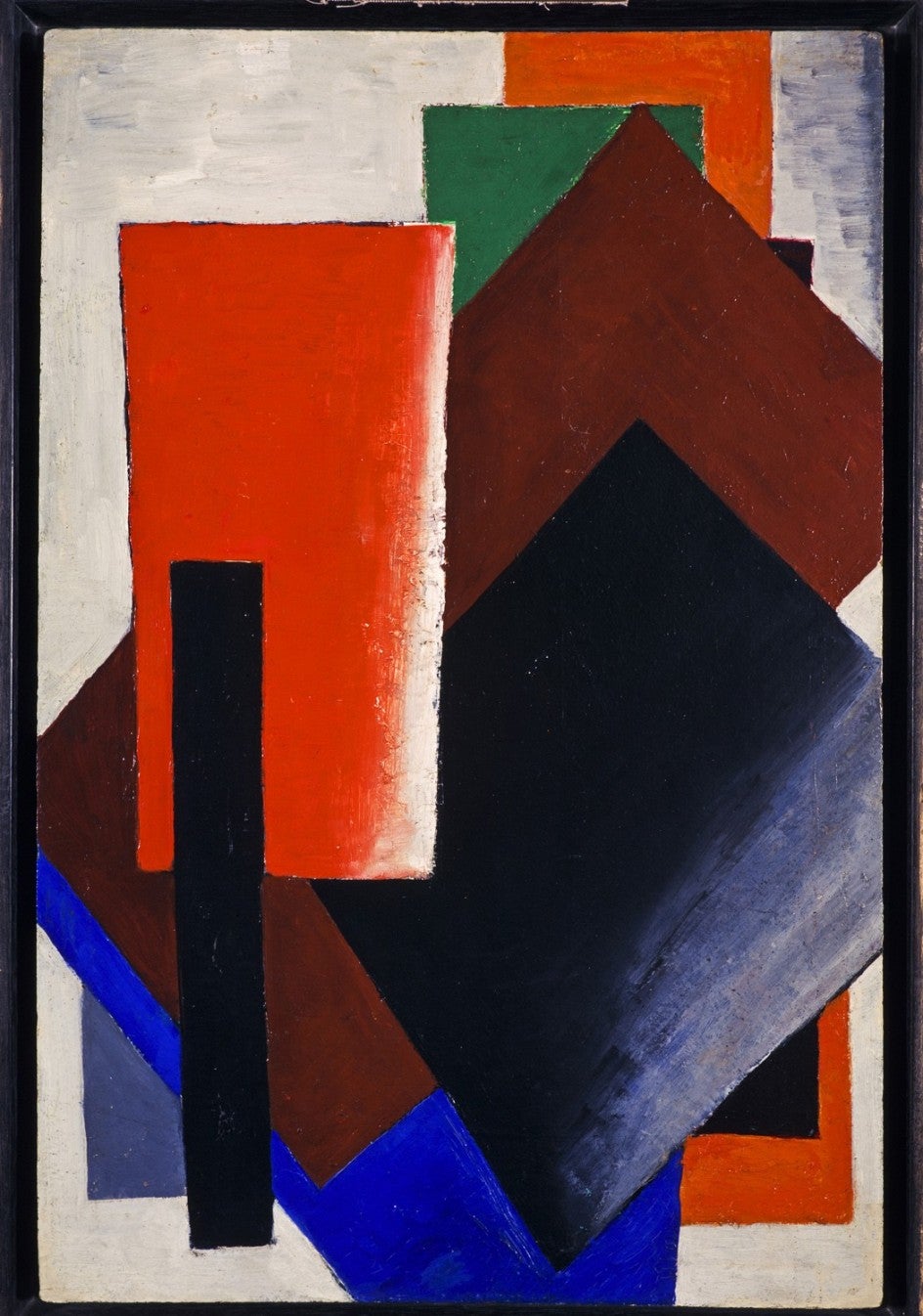 En altres peces de la sèrie, aquesta opció encara s’accentua més i els plànols d’un cromatisme saturat s’engrandeixen, se solapen i, com si hi suraren, ocupen bona part de l’espai, un espai obert, sense cap referent. Composicions sòbries que mantenen una delicada estabilitat entre les distintes superfícies, línies, textures i colors i en les quals el negre quasi sempre juga un paper important. De mica en mica, els aspectes constructivistes hi esdevenien preponderants, malgrat que mai no va veure cap contradicció entre aquest moviment i el suprematisme. En el fons, palesaven visions diferents dels principis creatius de l’art que es van reflectir, arran de la Revolució d’Octubre del 1917, en les discussions que van tindre lloc en el si de les avantguardes russes entorn de la idoneïtat de la composició o la construcció, el quadre o la forma espacial, la creació individual o la producció… El sistema comunista que hi havia sorgit necessitava desenvolupar un programa específic i un mètode pedagògic per a l’ensenyament artístic i Liubov Popova s’hi va involucrar des del primer moment.