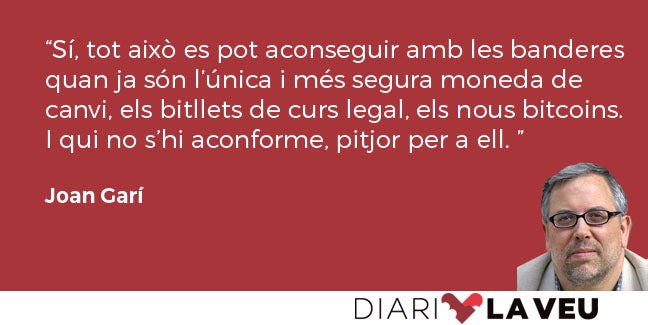 Sí, tot això es pot aconseguir amb les banderes quan ja són l’única i més segura moneda de canvi, els bitllets de curs legal, els nous bitcoins. I qui no s’hi aconforme, pitjor per a ell. Molt prompte els qui reneguem de les banderes serem els nous ateus, i el ramat ens observarà amb malfiança. Però entre nosaltres circularà una consigna, el vell lema anarquista, una frase rotunda en la seua reposada resolució, una divisa indestructible: “La millor bandera és la que crema més ràpid”…