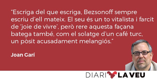 Entre les noves veus que han emergit en aquests darrers anys dins la literatura catalana, no m’equivocaré si assenyale Joan-Daniel Bezsonoff com l’autor d’un dels registres sonors més ric i atractiu. Al capdavall, té les dues condicions necessàries per a l’èxit: una història personal a contar i un estil dúctil i plàstic per a fer-ho. És per això, supose, que tots els seus llibres s’assemblen tant. No importa que es tracte de les primeres novel·les publicades gairebé clandestinament per l’editorial Trabucaire (quan només Toni Royo li feia cas) o dels títols més recents, que l’han convertit en un autor de fama. Escriga del que escriga, Bezsonoff sempre escriu d’ell mateix. El seu és un to vitalista i farcit de joie de vivre, però rere aquesta façana batega també –de manera creixent–, com el solatge d’un café turc, un pòsit acusadament melangiós.
