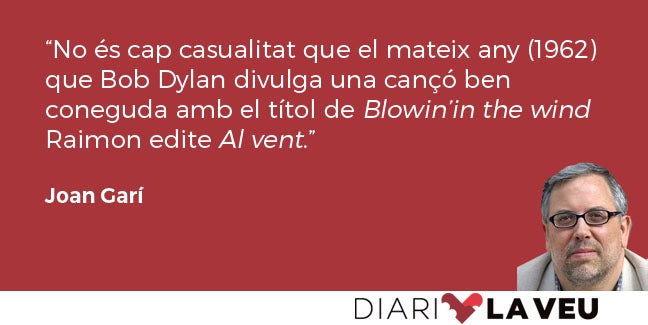 Sempre m’ha interessat la Nova Cançó. Per la seua explosió de creativitat musical i poètica i com a fenomen essencial de difusió i pervivència de la nostra llengua en els temps més difícils. D’una manera o altra, aquell moviment que va nàixer a finals dels 50 i que arriba fins ara mateix és probablement l’element que millor simbolitza el canvi que van suposar els anys 60 –a casa nostra i a nivell mundial. No és cap casualitat que el mateix any (1962) que Bob Dylan divulga una cançó ben coneguda amb el títol de Blowin’ in the wind Raimon edite Al vent. Aquest vent de canvi –que és el mateix, com ja vaig fer notar fa anys, que penetra als dominis del príncep de Salina en la versió cinematogràfica de Il gattopardo, del mateix any–, aquest huracà sense remissió, inaugura una dècada que posaria les bases de moltes transformacions essencials.