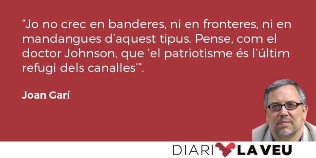 Jo no crec en banderes, ni en fronteres, ni en mandangues d’aquest tipus. Pense, com el doctor Johnson, que “el patriotisme és l’últim refugi dels canalles”. I rubrique lletra a lletra el vell eslògan anarquista: “La millor bandera és la que crema més ràpid”. Però els problemes socials han de resoldre’s amb cap i amb seny, i és evident que el ”problema català” no té una solució ni policial ni judicial.
