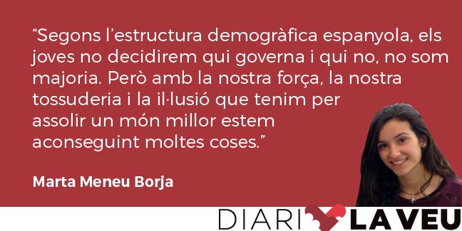 Aproximadament, més d’un milió i mig de joves estrenarem el dret a vot en les pròximes eleccions espanyoles. Segons l’estructura demogràfica espanyola, els joves no decidirem qui governa i qui no, no som majoria. Però amb la nostra força, la nostra tossuderia i la il·lusió que tenim per assolir un món millor estem aconseguint moltes coses. Hem posat el canvi climàtic en l’agenda política, la lluita per la igualtat. Som capaços de construir sinergies molt fortes. Igual que l’Ibuprofeno i el Paracetamol. Potser sols, reciclant a casa i llegint llibres sobre feminisme, aconseguim alguna cosa, però quan eixim al carrer junts fem més. Sinergia és una paraula grega, significa “cooperació”. El vot funciona igual. Un únic vot dona això, un vot. Però un vot, més un altre, més un altre aconsegueix molt més. Les concentracions han de traduir-se en canvis reals. El 28 d’abril pot ser el dia que les reivindicacions del carrer arriben a les institucions o, almenys, que arribe gent que ens escolte.