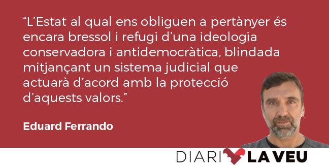 Comptat i debatut, la impressió que em queda no es mou ni un mil·límetre de la que percep des de fa molt de temps: l’Estat al qual ens obliguen a pertànyer és encara bressol i refugi d’una ideologia conservadora i antidemocràtica, blindada mitjançant un sistema judicial que actuarà d’acord amb la protecció d’aquests valors. Si algú ho dubta, pot fer un moment de reflexió i pensar en la impunitat amb què compten els feixistes o en l’empresonament de persones per demanar democràcia o la persecució d’artistes que critiquen la Corona, i si encara no en té prou, potser hauria de pensar si realment els seus ideals són realment democràtics o s’ha de començar a preocupar.