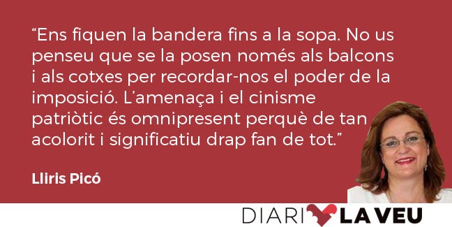 Ens fiquen la bandera fins a la sopa. No us penseu que se la posen només als balcons i als cotxes per recordar-nos el poder de la imposició. L’amenaça i el cinisme patriòtic és omnipresent perquè de tan acolorit i significatiu drap fan de tot: polseres, camisetes, bufandes… que llueixen, cofois, amb un somriure burleta com un vestit de festa, com un uniforme de guerra, perquè la violència –no ens enganyem– els recorre les venes. Se la posen també en els perfils de Facebook (moltes vegades sense donar la cara) que usen per a trolejar pels nostres murs, com si la bandera els fera millors persones, els distingira dels altres, de nosaltres: els homes i les dones que creiem en la igualtat independentment dels colors de les banderes, els que mirem un immigrant i només veiem una persona, els que hem lluitat pels drets LGTB+. I, sí: realment la bandereta els marca, els assenyala. Ens ha d’alertar: són racistes, masclistes i xenòfobs. Compte amb ells!