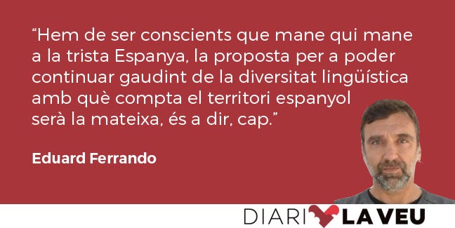 No ens en queda una altra. Hem de ser conscients que mane qui mane a la trista Espanya, la proposta per a poder continuar gaudint de la diversitat lingüística amb què compta el territori espanyol serà la mateixa, és a dir, cap. Potser, i ho deixe en condicional absolut, algun dia tindrem la sort de comptar amb un Govern espanyol que respecte sincerament el fet que no tots ens comuniquem amb la mateixa llengua; o potser, i em reafirme en el condicional, algun dia tindrem la sort que el nostre govern no tindrà res a veure amb la nostàlgia espanyola d’aquells grisos escenaris que cada dia són més vergonyosament habituals.