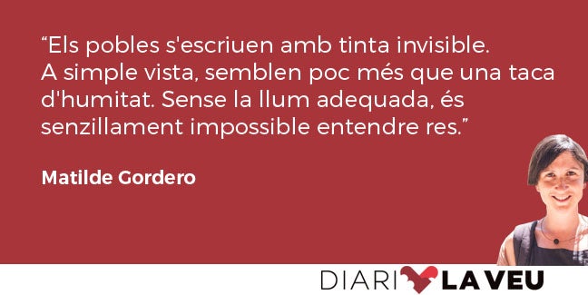 I què es fa, en qualsevol altre poble, ara mateix? Què pensaria algú que posara un peu en la part del meu poble que, inclús en estiu, és poble? Buit, avis, cervesa en gots de tub, taules de plàstic vermell. Res, no veuria res, com jo no veia res: els pobles s’escriuen amb tinta invisible. A simple vista, semblen poc més que una taca d’humitat. Sense la llum adequada, és senzillament impossible entendre res. Els pobles s’escriuen amb tinta invisible però una –de poble– se n’oblida sovint.