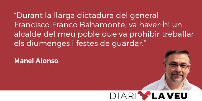 Durant la llarga dictadura del general Francisco Franco Bahamonde, va haver-hi un alcalde del meu poble que va prohibir treballar els diumenges i festes de guardar. Al poder, per irrisori i ridícul que siga, i a aquells que l’exercixen els agrada omplir de lleis i prohibicions les nostres vides, n’hi ha tantes que sovint es contradiuen les unes a les altres.