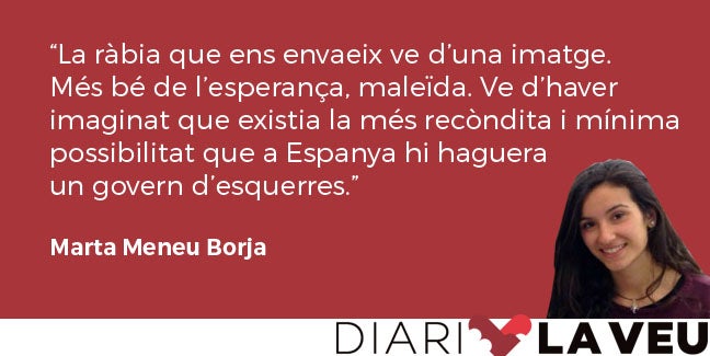 La ràbia que ens envaeix ve d’una imatge. Més bé de l’esperança, maleïda. Ve d’haver imaginat que existia la més recòndita i mínima possibilitat que a Espanya hi haguera un govern d’esquerres. D’esquerres plurals. Però ara l’espill còncau transforma eixa esquerra plural en… en què?! L’esperpent és això. Imatges belles absurdes. Deformades. Tindre-ho a tocar de les mans i perdre-ho. Recordar tot l’esforç de la gent, manifestacions, mobilitzacions i moviments. Com si algun titellaire es trencara de riure allà dalt, o allà dins. La pregunta és qui ha transformat amb la matemàtica perfecta d’espill còncau aquella possibilitat ideal, idíl·lica!, en terror. En esperpent. I actuar en conseqüència.