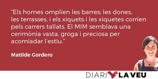 Els homes omplien les barres; les dones, les terrasses, i els xiquets i les xiquetes corrien pels carrers tallats. El MIM semblava una cerimònia vasta, groga i preciosa per acomiadar l’estiu. Açò és, doncs, una crònica de transició estacional a una vila mediterrània i valenciana de places i carrers empedrats; de portes obertes i poques taules lliures on sopar.