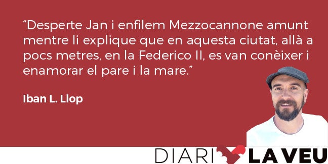 Desperte Jan i enfilem Mezzocannone amunt mentre li explique que en aquesta ciutat, allà a pocs metres, en la Federico II, es van conèixer i enamorar el pare i la mare. Li conte les vegades que vam trepitjar aquest carrers, amb el tiet Isma, sols, imaginant futurs. Que allà dalt, a Spaccanapoli, vaig esperar una vegada Josep Piera i que haurem d’anar un dia a trobar-lo a La Drova, i que passarem un dia magnífic i inoblidable. Ell va dient que sí a tot, tombem per Enrico De Marinis i li ensenye l’Orientale, on vaig treballar uns anys i de nit anàvem a prendre unes cerveses envoltats de la flaire de haixix (això no li ho dic). Amunt per San Giovanni Maggiore Pignatelli fins a Pallonetto Santa Chiara.