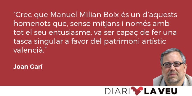 Crec que Manuel Milian Boix és un d’aquests homenots que, sense mitjans i només amb tot el seu entusiasme, va ser capaç de fer una tasca singular a favor del patrimoni artístic valencià. Dalt d’un matxo, amb un llapis i un paper per tota tecnologia, es va recórrer totes les esglésies i ermitoris de la diòcesi per inventariar el seu tresor i quan, molts anys després, va coincidir amb el Concili Vaticà II, va participar en la mesura de les seues forces en aquest extraordinari esforç d’aggiornamento de l’església catòlica.