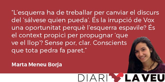 Mirí cap arrere i el xic asiàtic ja no estava. Les persones del meu voltant continuaven caminant amb la mirada perduda pel carrer. Sabates de tacó, americanes, smartphones i auriculars inalàmbrics. Sembla que la població estiga expressant mitjançant el vot un desesperat “sálvese quién pueda” enmig d’un viratge individualista, egoista i intolerant. Por és l’única paraula que descriu la ressaca postelectoral. La dreta sempre empra el terme “efecto llamada” per induir a la por quant a la crisi migratòria. L’efecte que espanta ara a l’esquerra és la propagació de l’extremadreta arreu l’estat. Al País Valencià votarem l’any que ve, si no passa res. Els valencians sabem en primera persona el que és la violència i la intolerància de l’extremadreta. I les diverses realitats de l’estat espanyol són de difícil comparació. Tanmateix, els partits progressistes valencians intenten ara evitar aqueix efecte de propagació. Criden a la mobilització i al treball. Fran Ferri digué en un tuit que no hi ha temps de lamentacions. I aleshores pense en el xic jove asiàtic que plorava. Plorava pel carrer, mentre caminava, mentre probablement es dirigia a classe. No hi ha temps de parar a lamentar-se, no. L’esquerra ha de treballar per canviar el discurs del “sálvese quien pueda”. És la irrupció de Vox una oportunitat perquè l’esquerra espavile? És el context propici per propugnar “que ve el llop”? Sense por, clar. Conscients que tota pedra fa paret.
