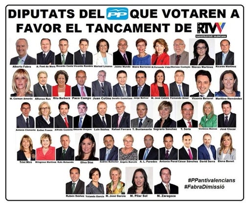 Durant aquest any de legislatura, les Corts, entre altres iniciatives, han escollit senadors territorials –¡representants de les Corts Valencianes al Senat!– dos dels màxims responsables del tancament de RTVV, a banda d’altres maleses. Rita Barberà i Alberto Fabra formen part de la institució més inútil de l’arquitectura europea, gràcies a l’abstenció activa dels tres partits del Pacte del Botànic!. De Rita, tots en coneixem el currículum delictiu; i Fabra, que té pendent el judici de la Fórmula 1, s’ha acollit als privilegis que li atorga l’estatut d’expresident. En paral·lel, els extreballadors de RTVV han consumit el subsidi de desocupació mentre suportem, estupefactes, una brutal campanya de difamació personal i professional, orquestrada per periodistes i empreses de comunicació amb interessos econòmics i de poder més que evidents.
