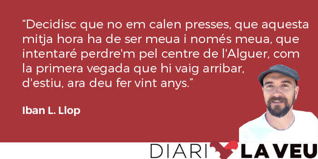 Decidisc que no em calen presses, que aquesta mitja hora ha de ser meua i només meua, que intentaré perdre’m pel centre de l’Alguer, com la primera vegada que hi vaig arribar, d’estiu, ara deu fer vint anys. En algunes placetes ja han desaparegut les taules i les cadires on fins fa poc s’asseien a poqueta nit turistes rossos, de pell encesa i panxa abundant. Placetes que són l’extensió del restaurant que ofereix al visitant italià de pell morena i lluenta la cuina de la mar i vi blanc.