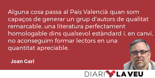 Alguna cosa passa al País Valencià quan som capaços de generar un grup d’autors de qualitat remarcable, una literatura perfectament homologable dins qualsevol estàndard on se’ns vulga mesurar, i en canvi no aconseguim formar lectors en una quantitat apreciable. Les xifres de venda dels llibres, perdoneu que us ho diga, són de riure: si un volum aconsegueix vendre 600 exemplars això ja es considera un gran èxit, perquè una primera edició no supera quasi mai aquesta xifra. El més normal, però, és que d’un llibre d’un autor mitjanament conegut no se’n venguen més de 200 o 300 exemplars.