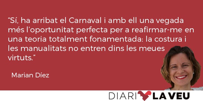 Si fóra possible, jo demanaria l’excedència de mare fins al soterrar de la sardina, però sembla que no és una opció vàlida, de manera que ahí he estat tot el cap de setmana amb la casa de cap per avall i amb una tensió cada volta que havia de tallar alguna peça de les disfresses dels meus fills, que em ric jo de les operacions a cor obert! Què dius? Si sols és Goma Eva… Però no, és molt més. Si ho faig mal és una altra taca en el meu currículum de mare perfecta.