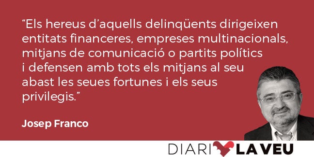 Ara mateix, els hereus d’aquells delinqüents dirigeixen entitats financeres, empreses multinacionals, mitjans de comunicació o partits polítics i defensen amb tots els mitjans al seu abast les seues fortunes i els seus privilegis.
