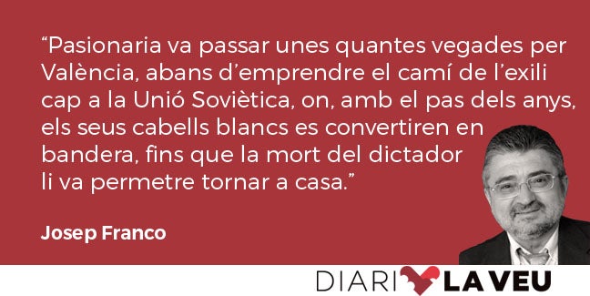 Des de l’any 1936 al 1939, Pasionaria va passar unes quantes vegades per València, abans d’emprendre el camí de l’exili cap a la Unió Soviètica, on, amb el pas dels anys, els seus cabells blancs es convertiren en bandera, fins que la mort del dictador li va permetre tornar a casa, amb la cara plena d’arrugues venerables i vestida sempre de dol, com si encarnara la llibertat que no acabava de consolidar-se.